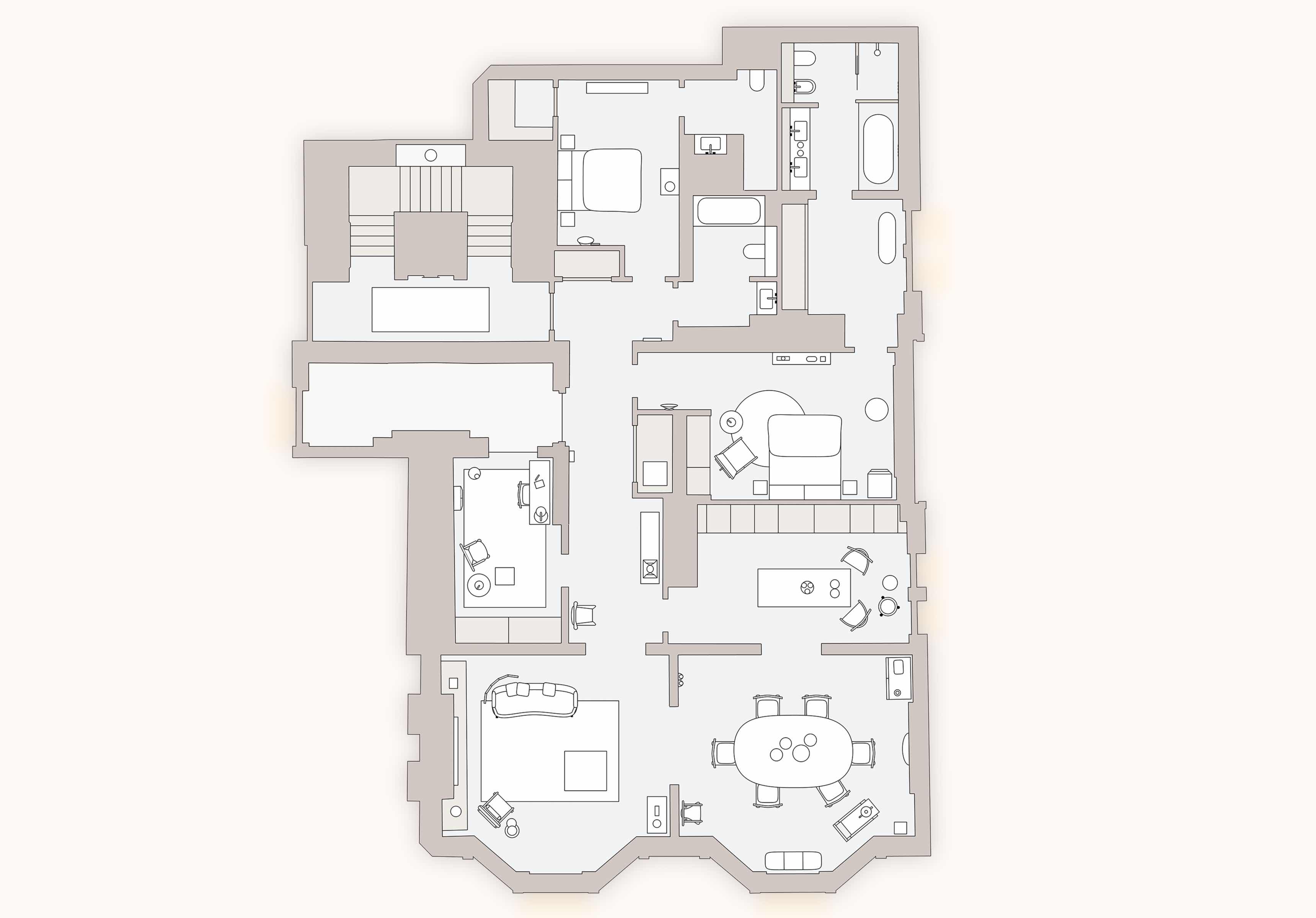 Illustration of interior space with furniture and decor, interpreted from photos of individual rooms of the apartment